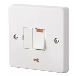 Double pole, switched fused connection unit with neon indicator. Marked with “hob”. Can be padlocked open. Knockout position in bottom edge of plate helps prevent access to terminals before outgoing cable is fitted.