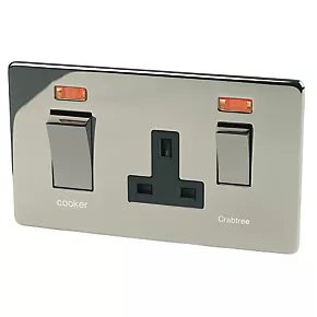 Be the first to review “Crabtree Platinum 45 A & 13A 2-Gang DP Cooker Switch & 13A DP Switched Socket Black Nickel with Neon with Black Inserts” Cancel reply